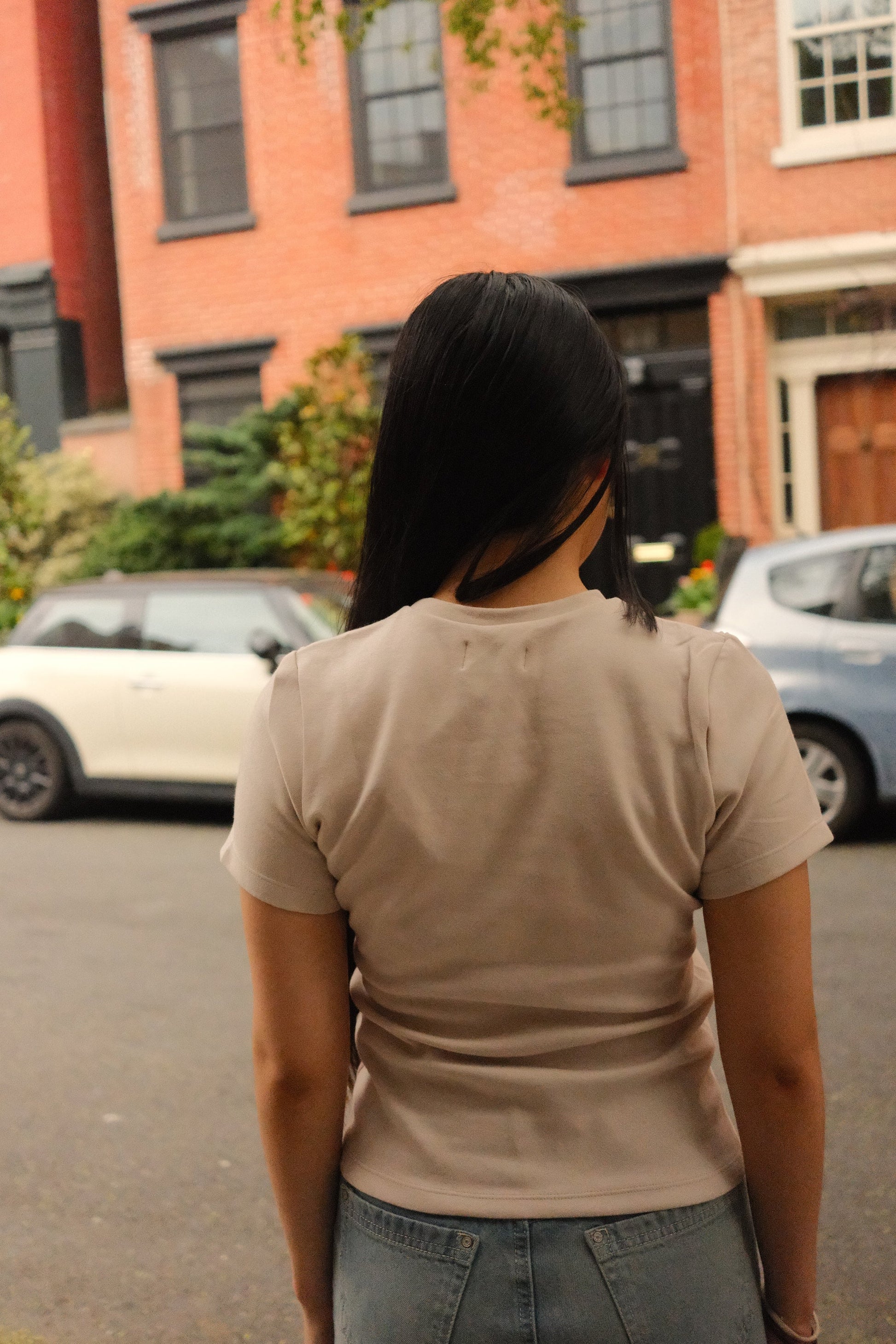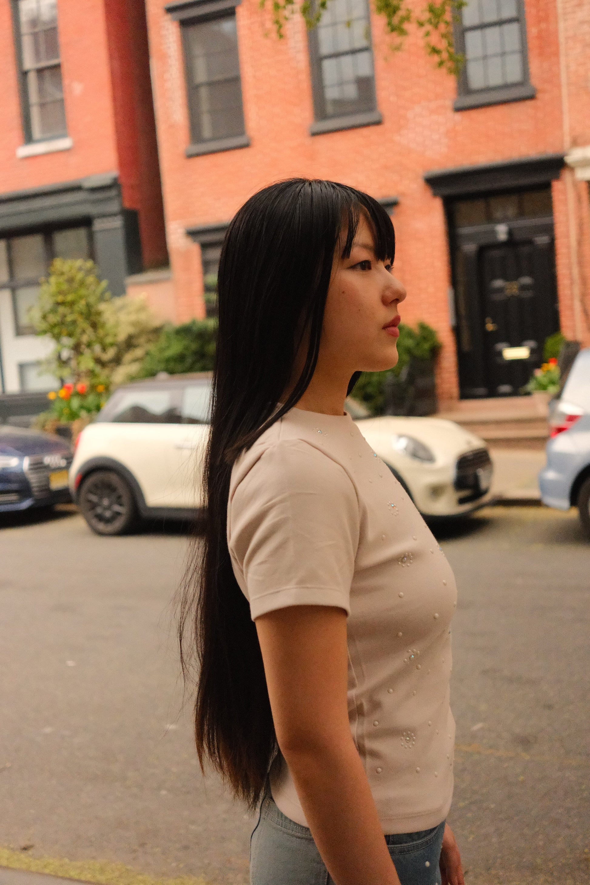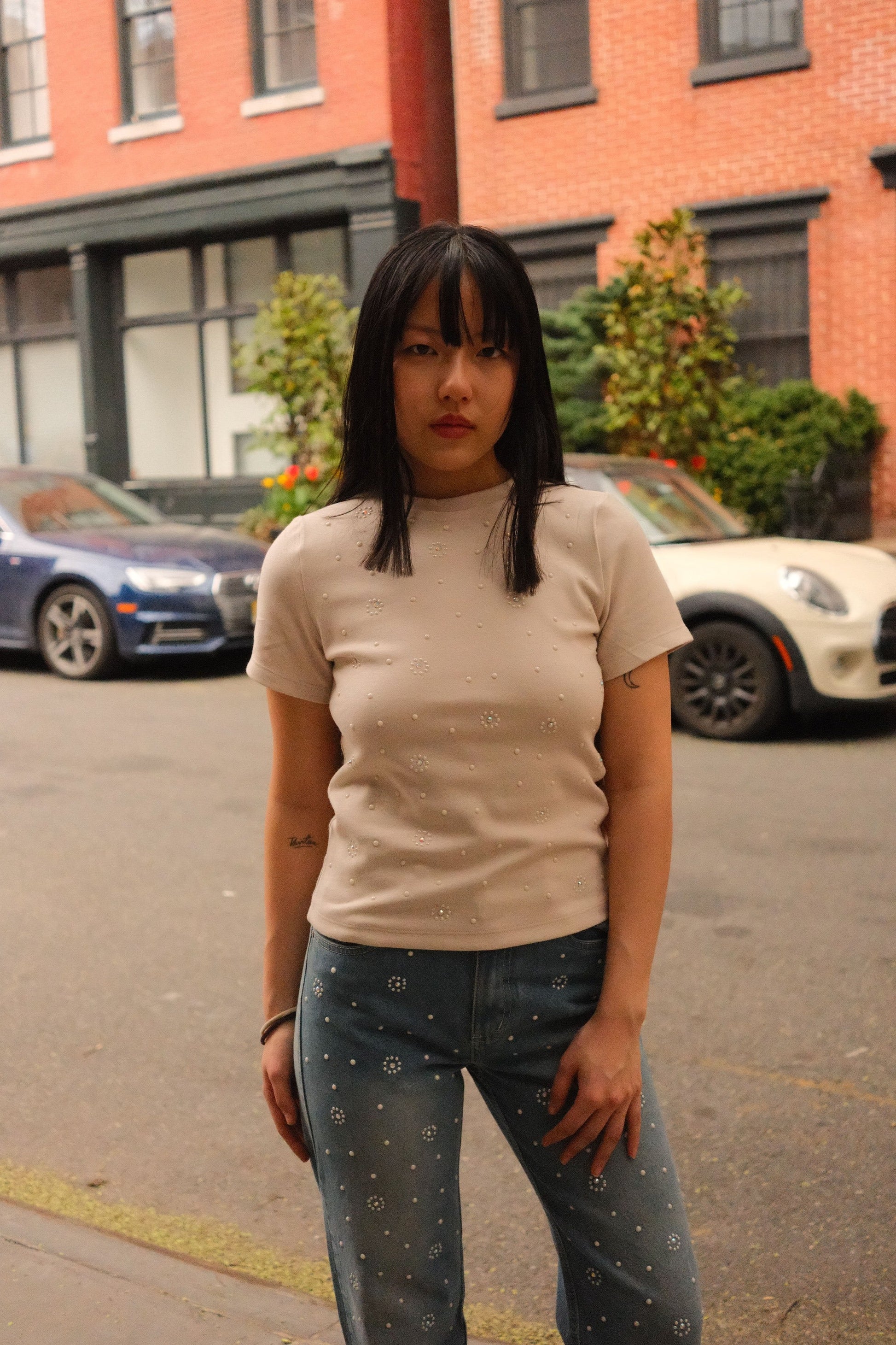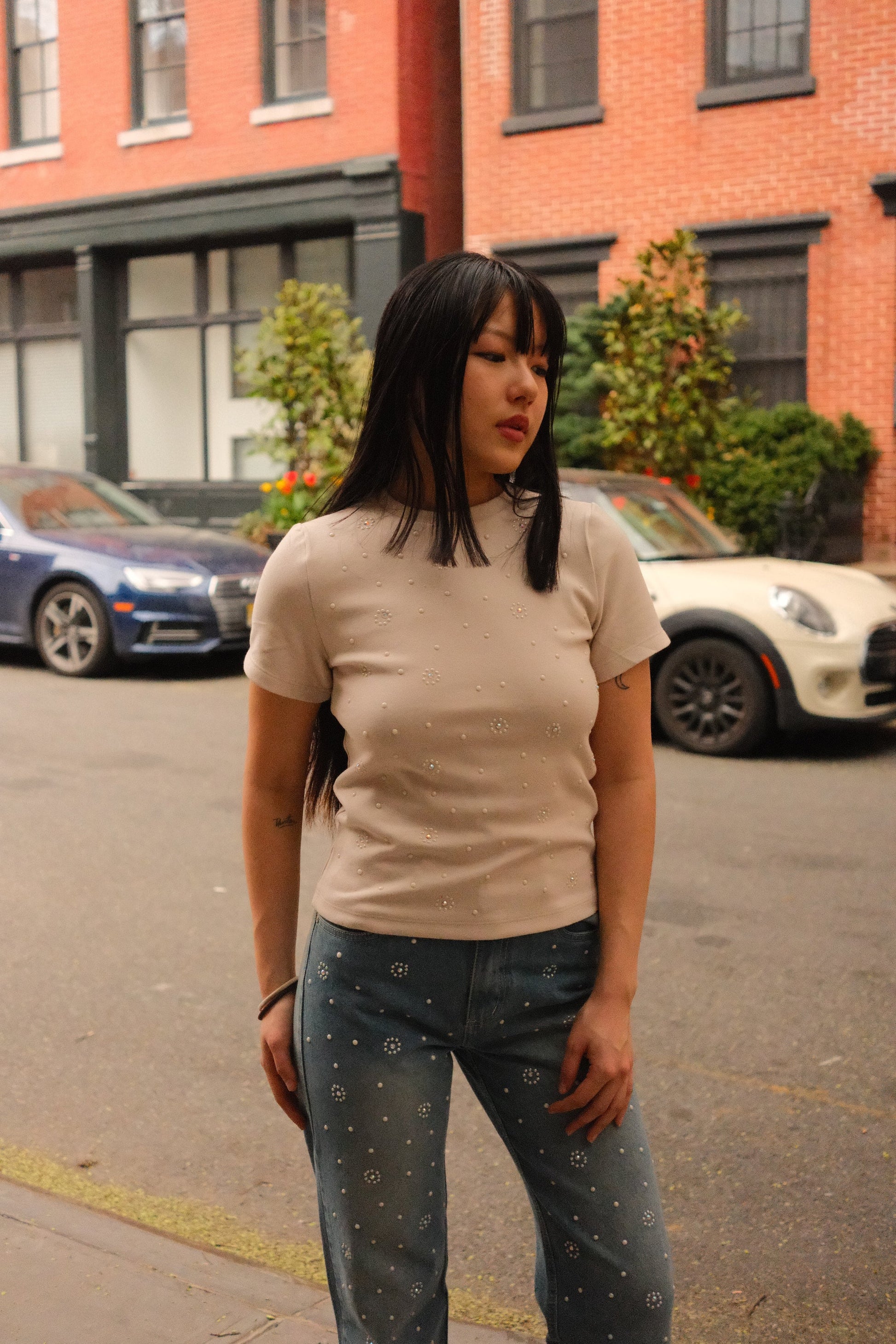 Beige T-shirt with pearl and flower appliqués — a very special piece to style your looks.