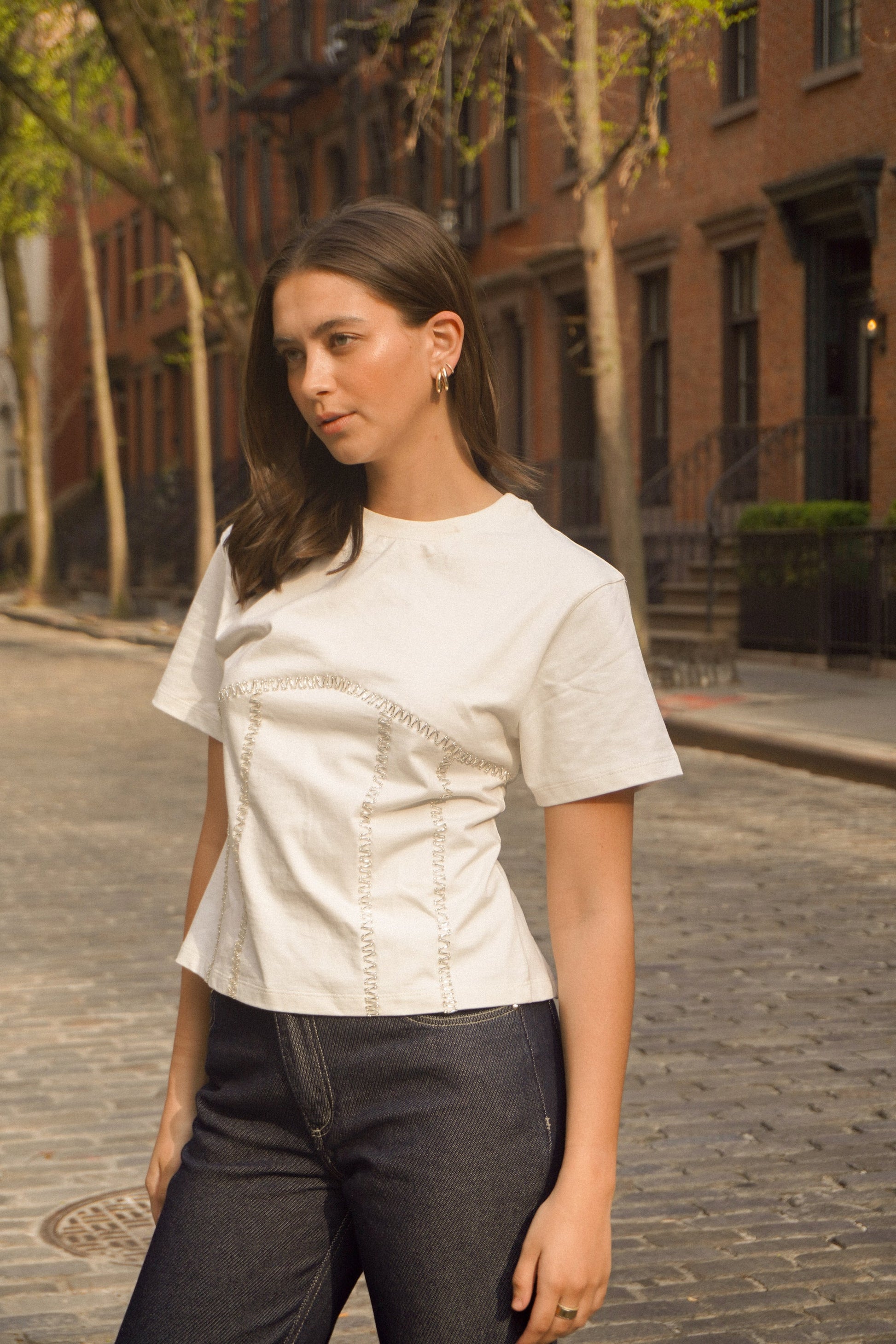 T-shirt with details that enhance the figure in the form of hand-embroidered corset designs. The fit of this tee features a round neck, cut-out, and a tie detail at the back.