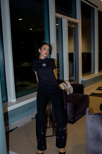 Jeans made of 100% cotton in black with a straight-leg cut. They are decorated with handmade star-shaped embroidery in various sizes and designs, giving them a unique touch. These jeans are the perfect choice for those looking for a statement piece to elevate any look. With a comfortable fit and modern cut, these exclusive jeans will add a unique piece to your wardrobe.