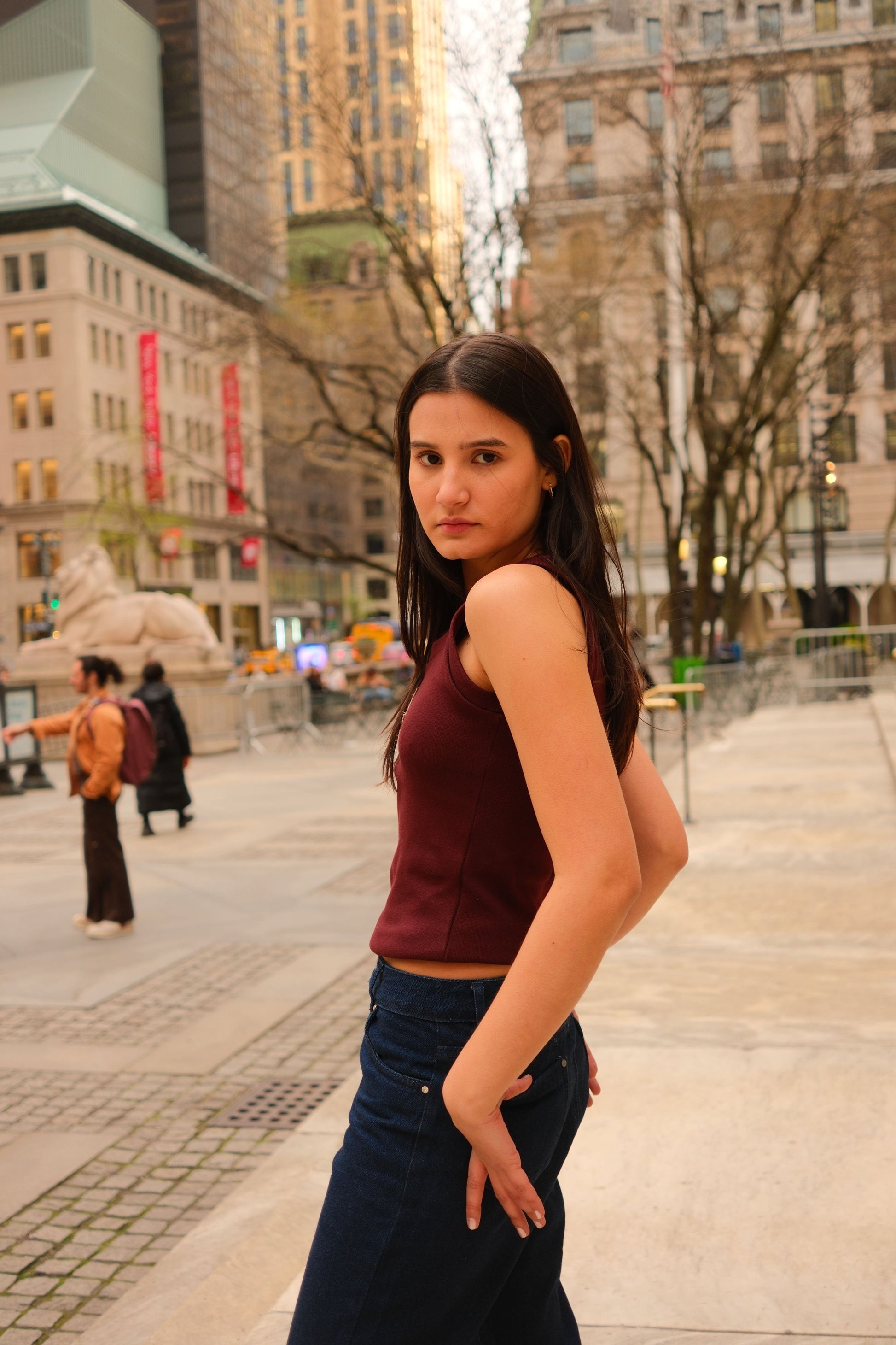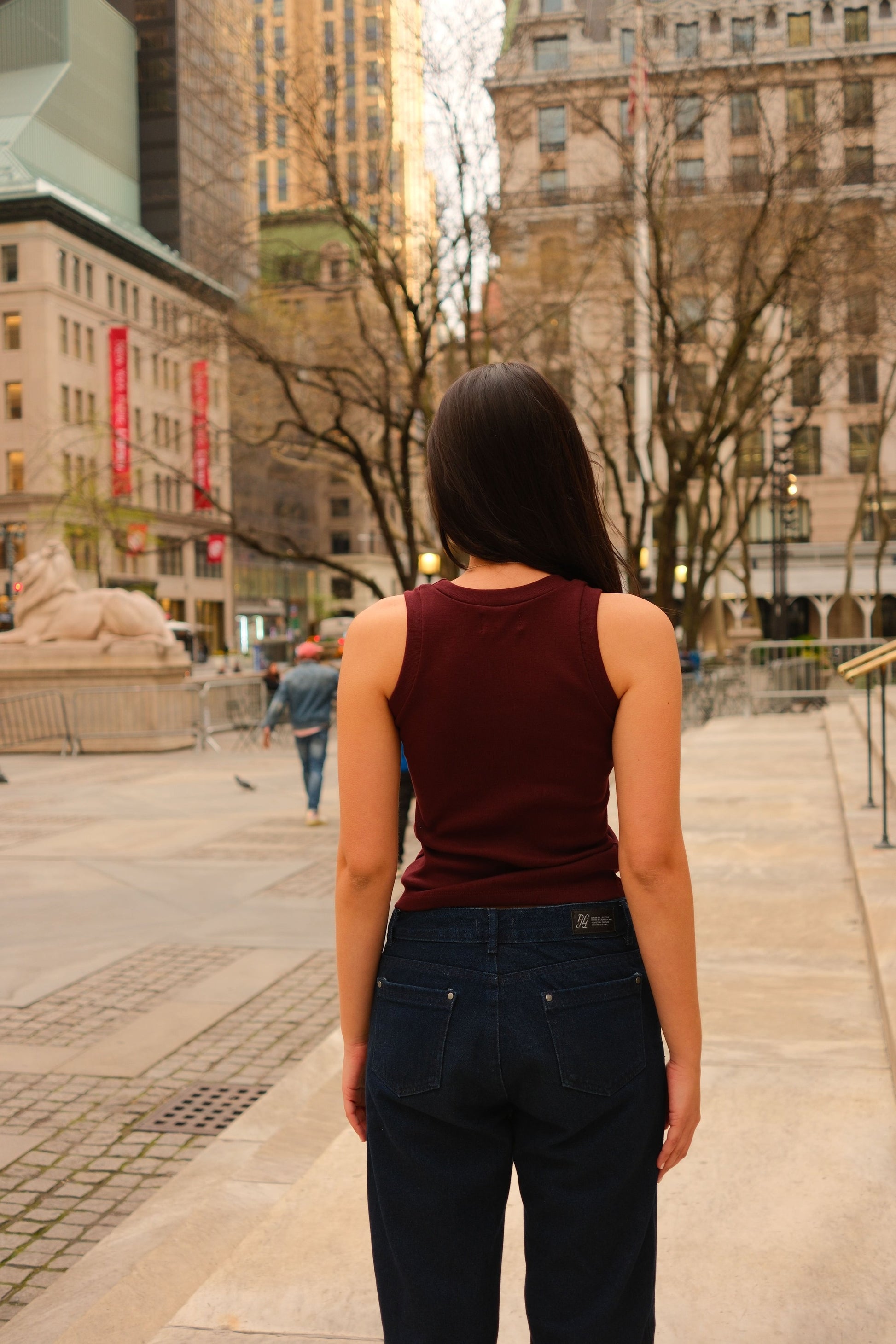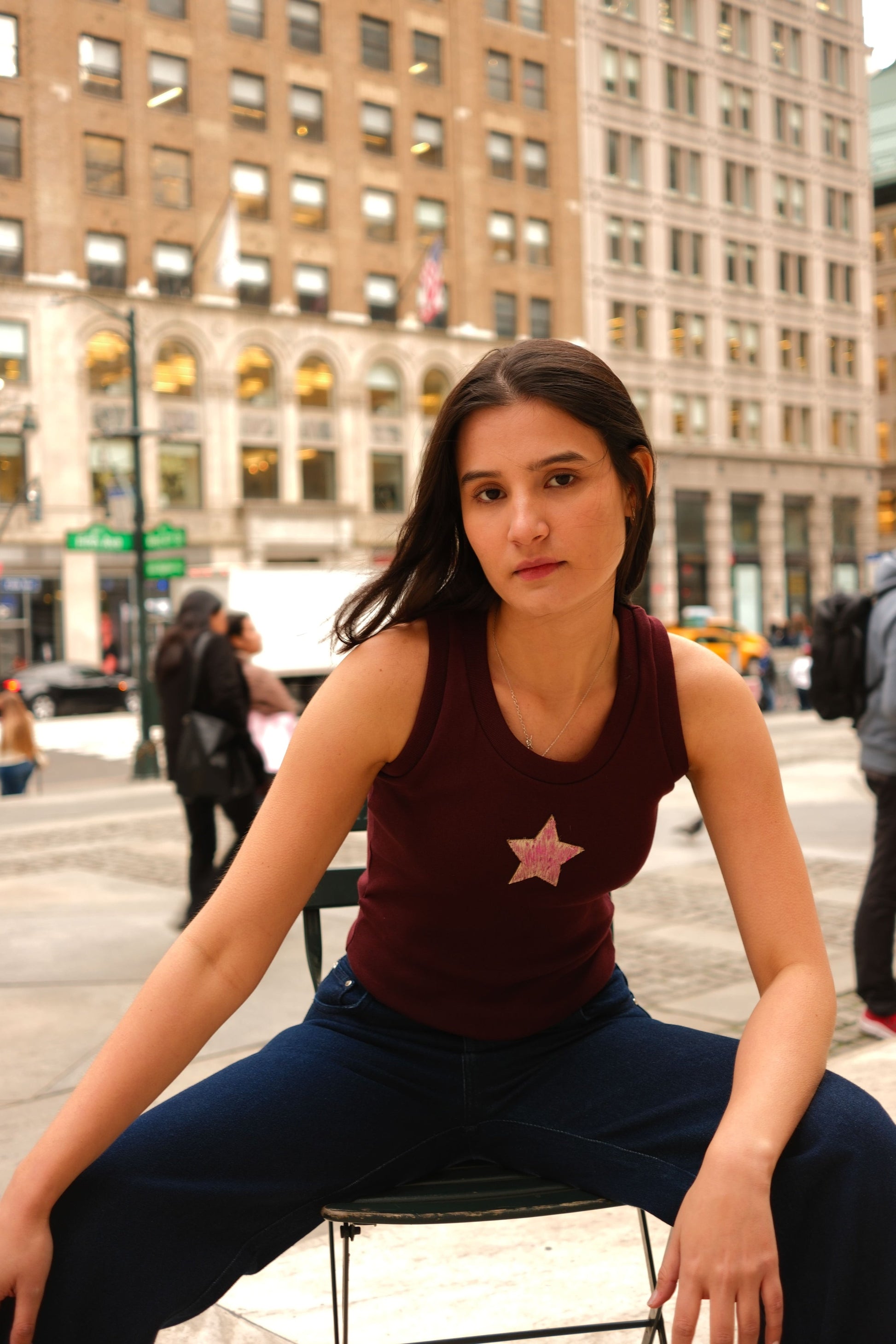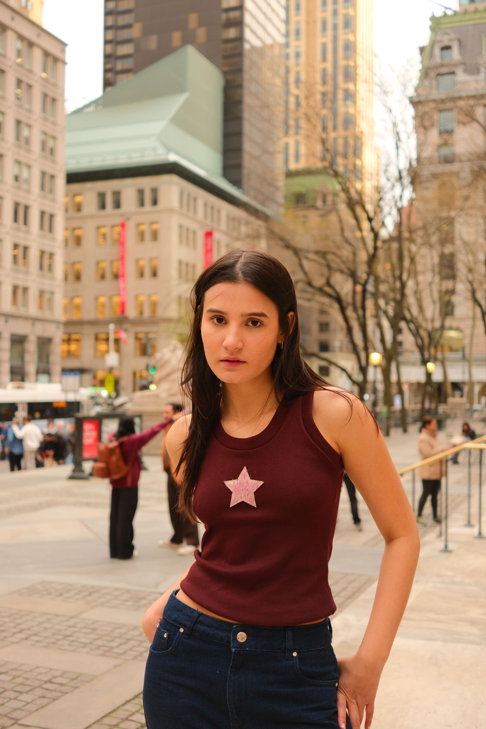 Wine-colored top made of cotton fabric, very comfortable and versatile. It features a metallic leather star.