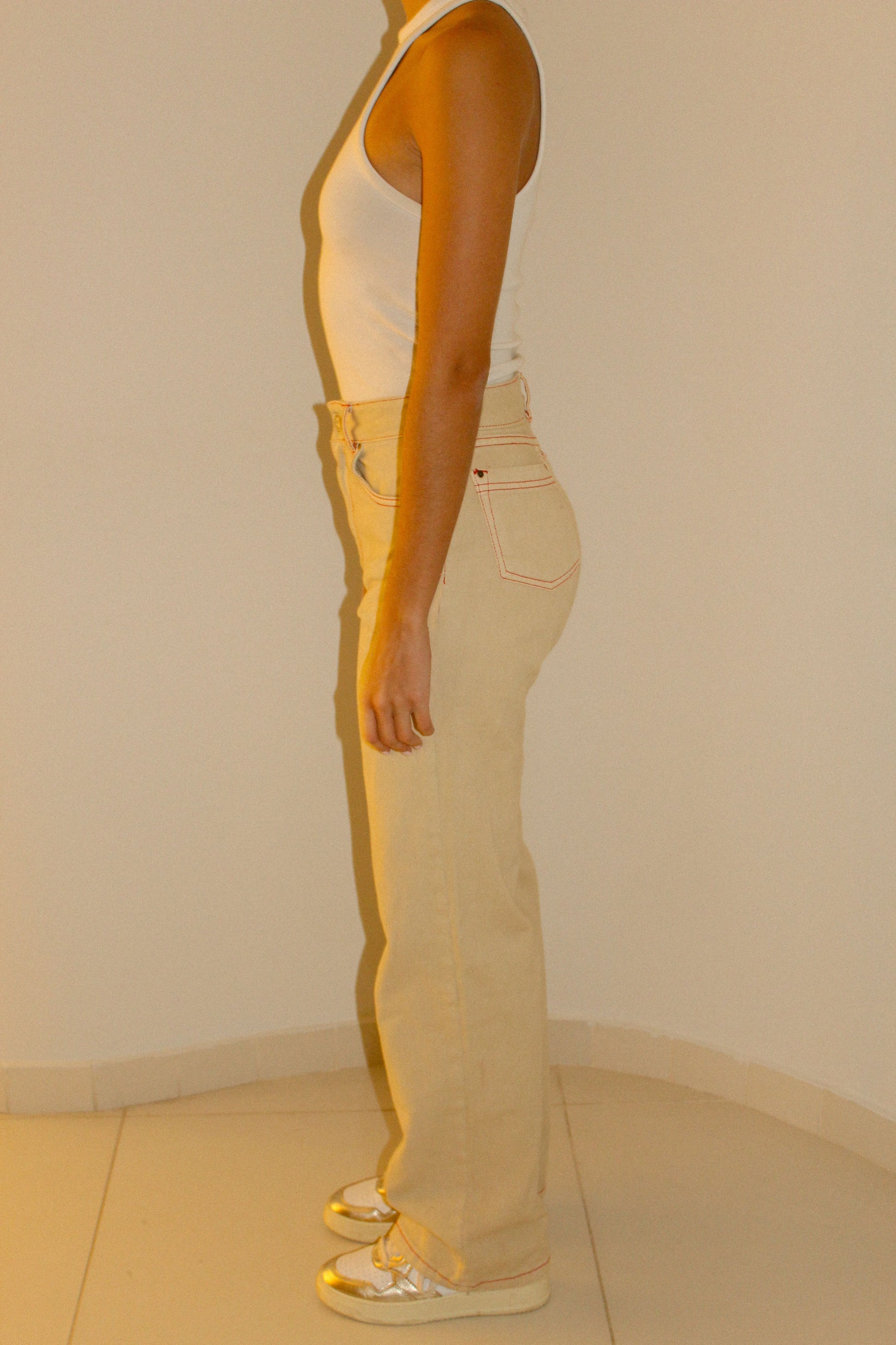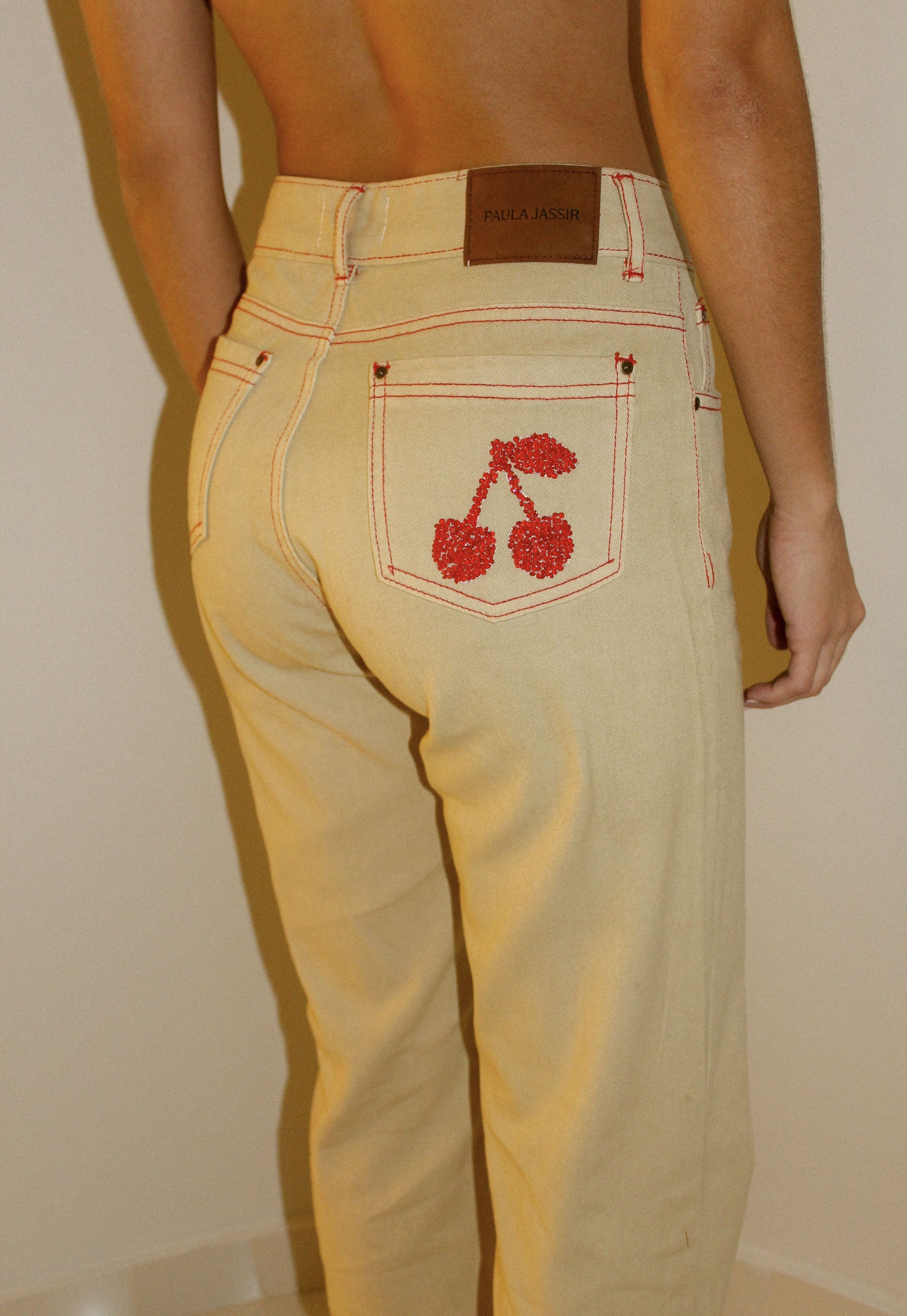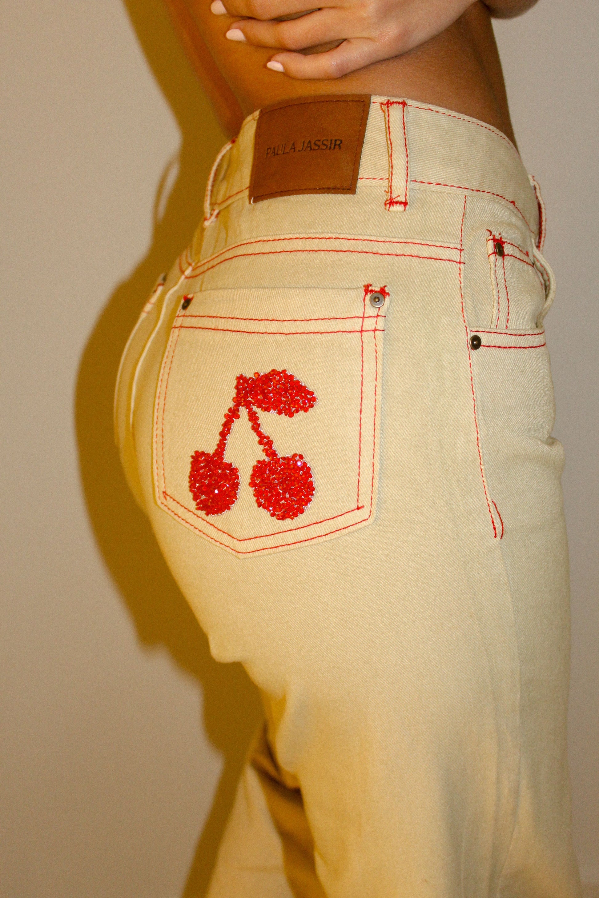 Jean 100% coton beige avec surpiqûres rouges, c'est un jean rigide qui s'adapte parfaitement à la silhouette de votre corps. Décoré d'une cerise rouge sur la poche arrière qui donne une touche unique à votre jean.