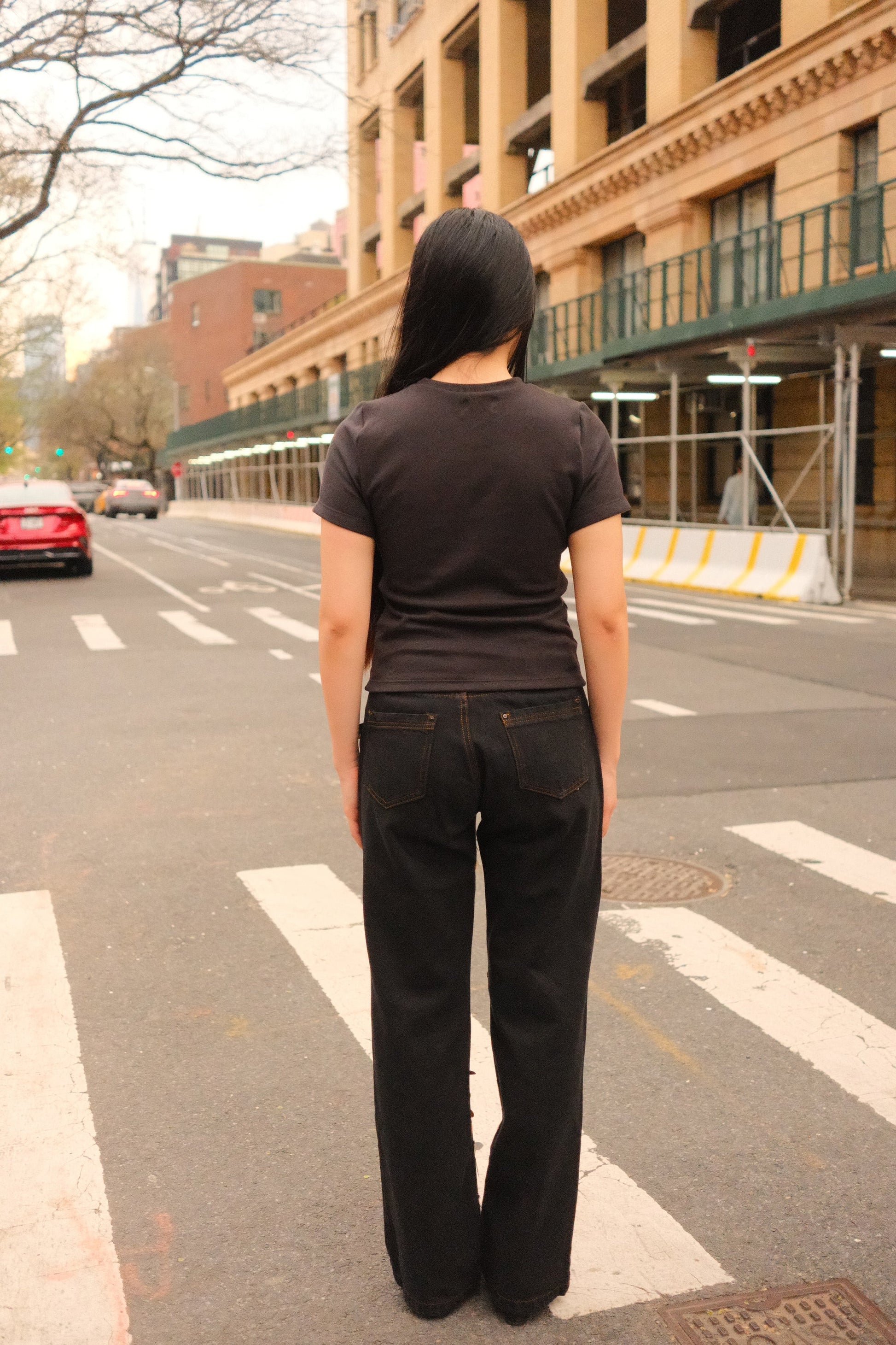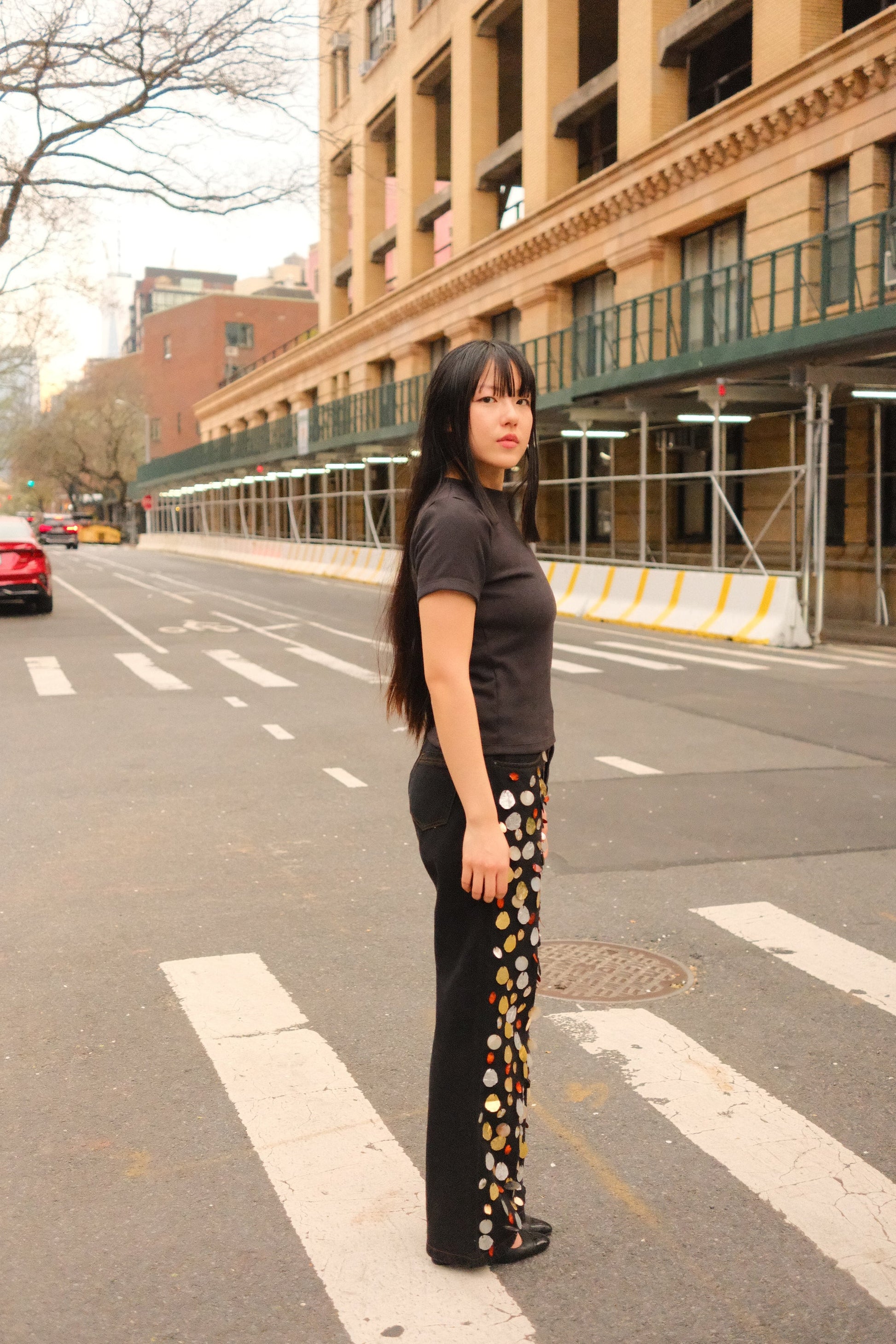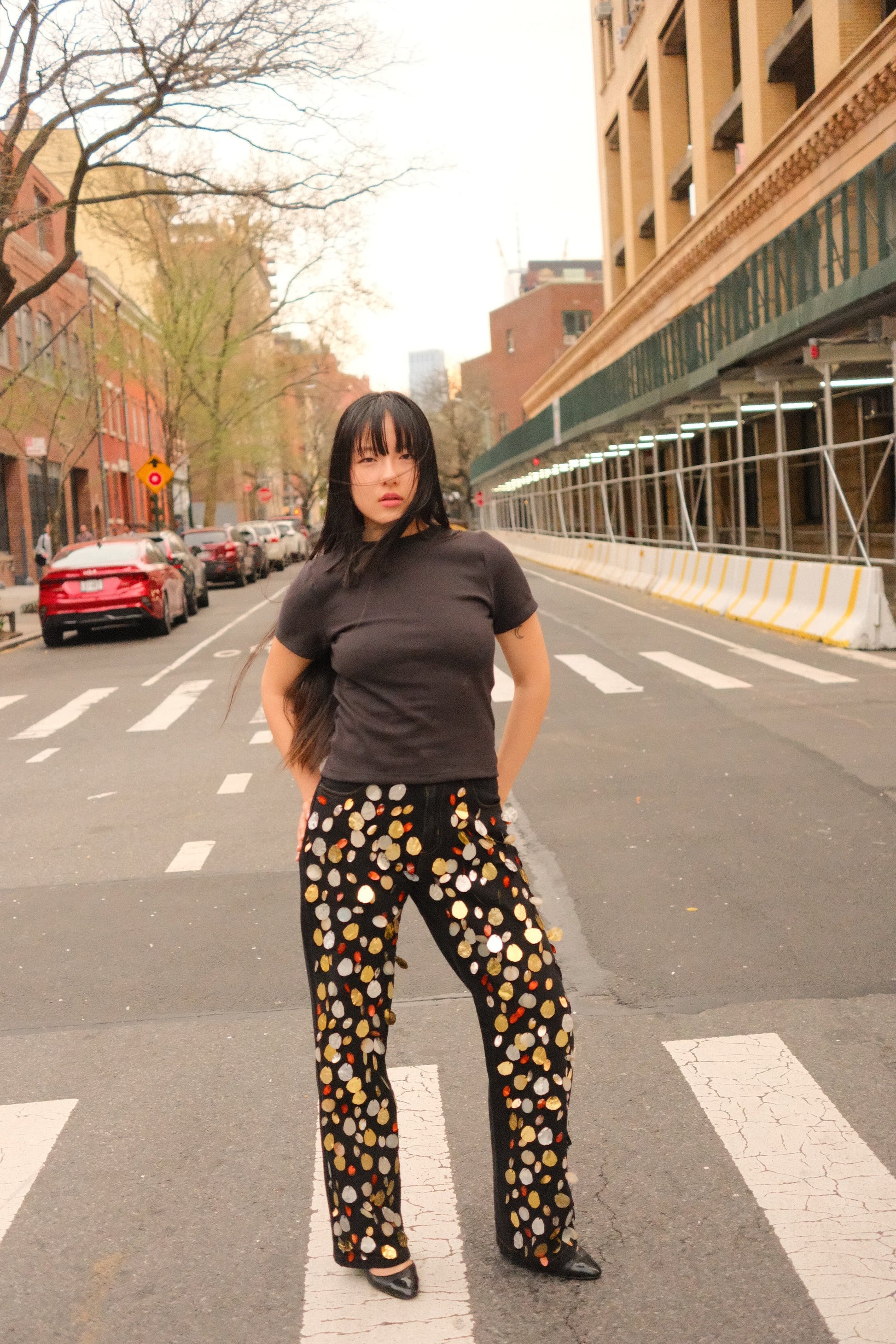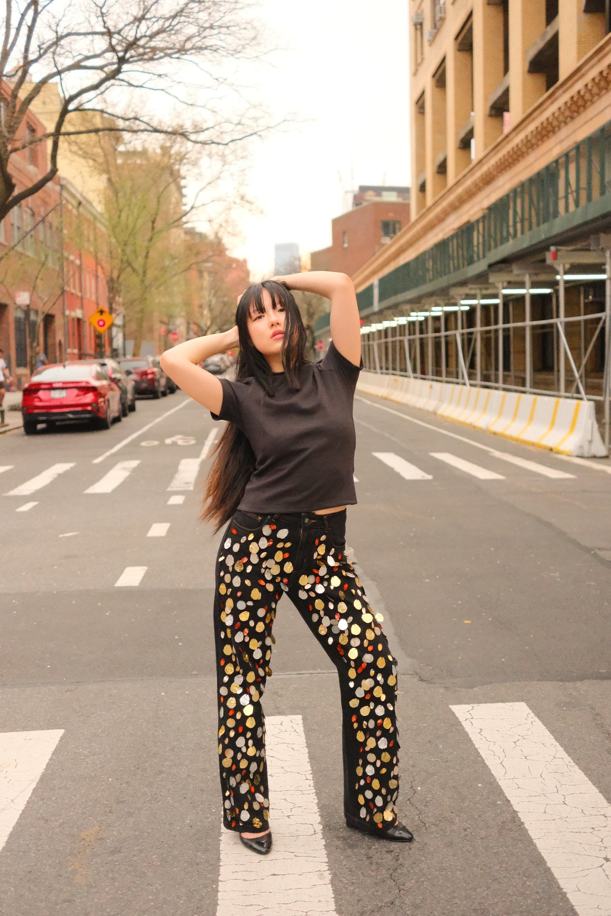 100% cotton black jeans with a straight-leg cut. Decorated with handcrafted Brazilian sequins sewn by hand over the course of 7 hours. The sequins come in various sizes and shapes, giving your jeans a unique touch.