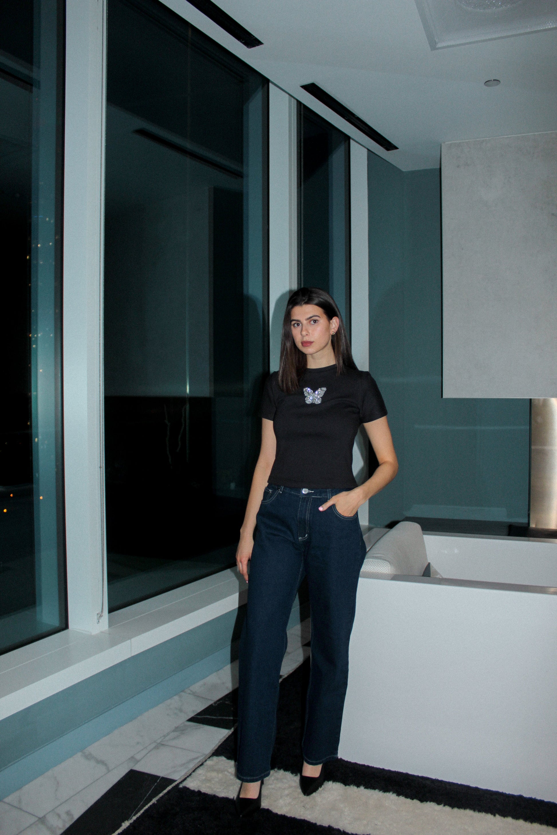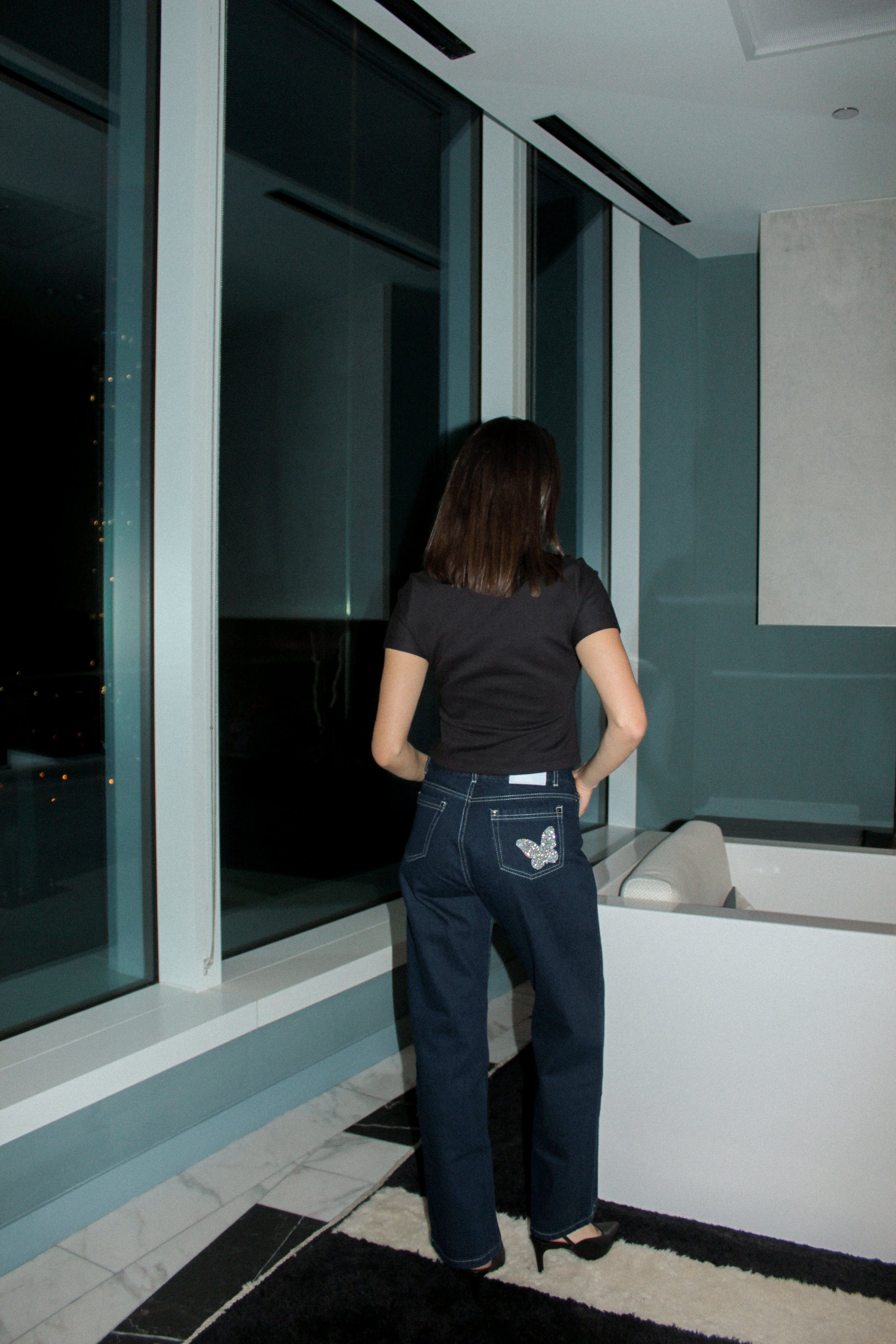 100% cotton jeans in classic indigo with a mid-to-high rise. They feature a semi-fitted silhouette around the waist and hips, straight legs, and white stitching. A butterfly embellishment on the back pocket adds a unique and delicate touch to these jeans.