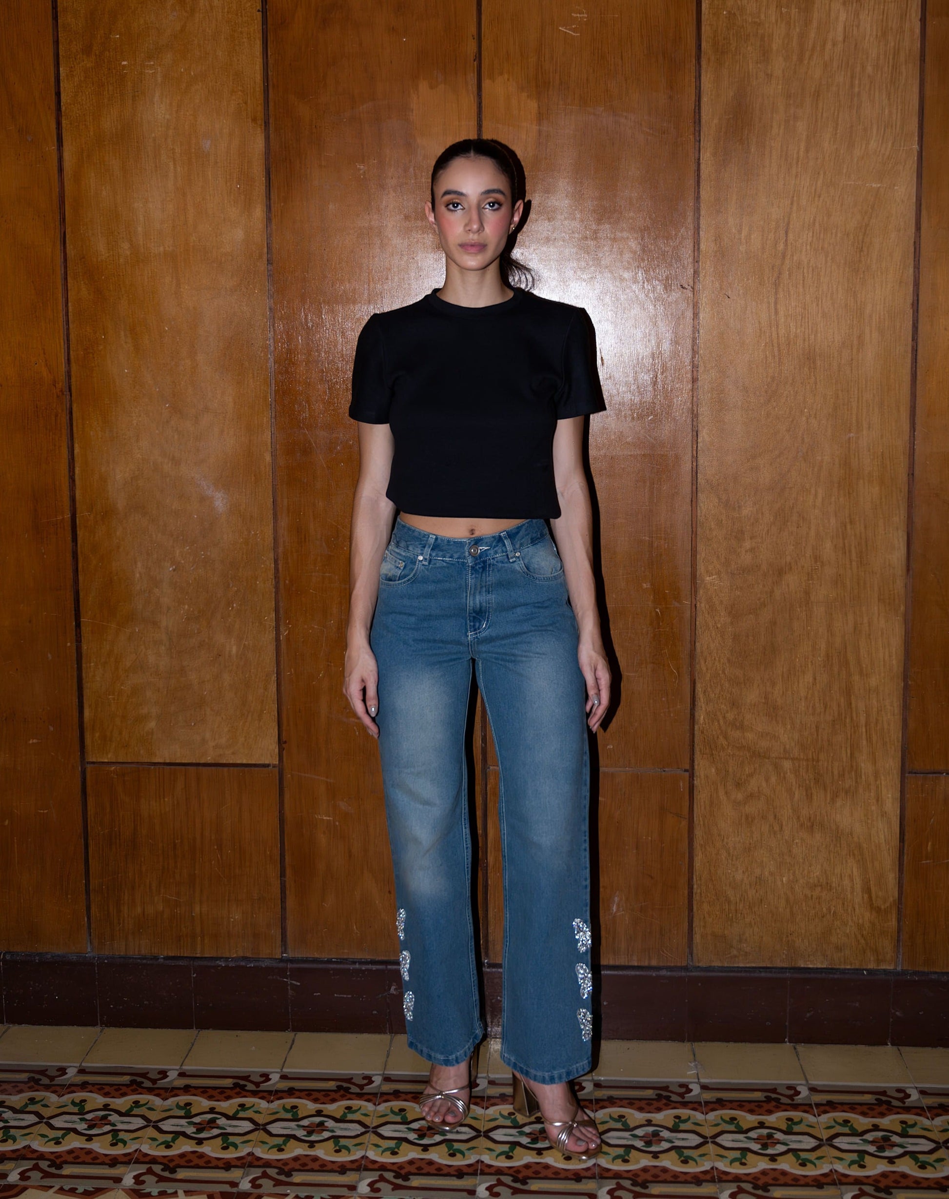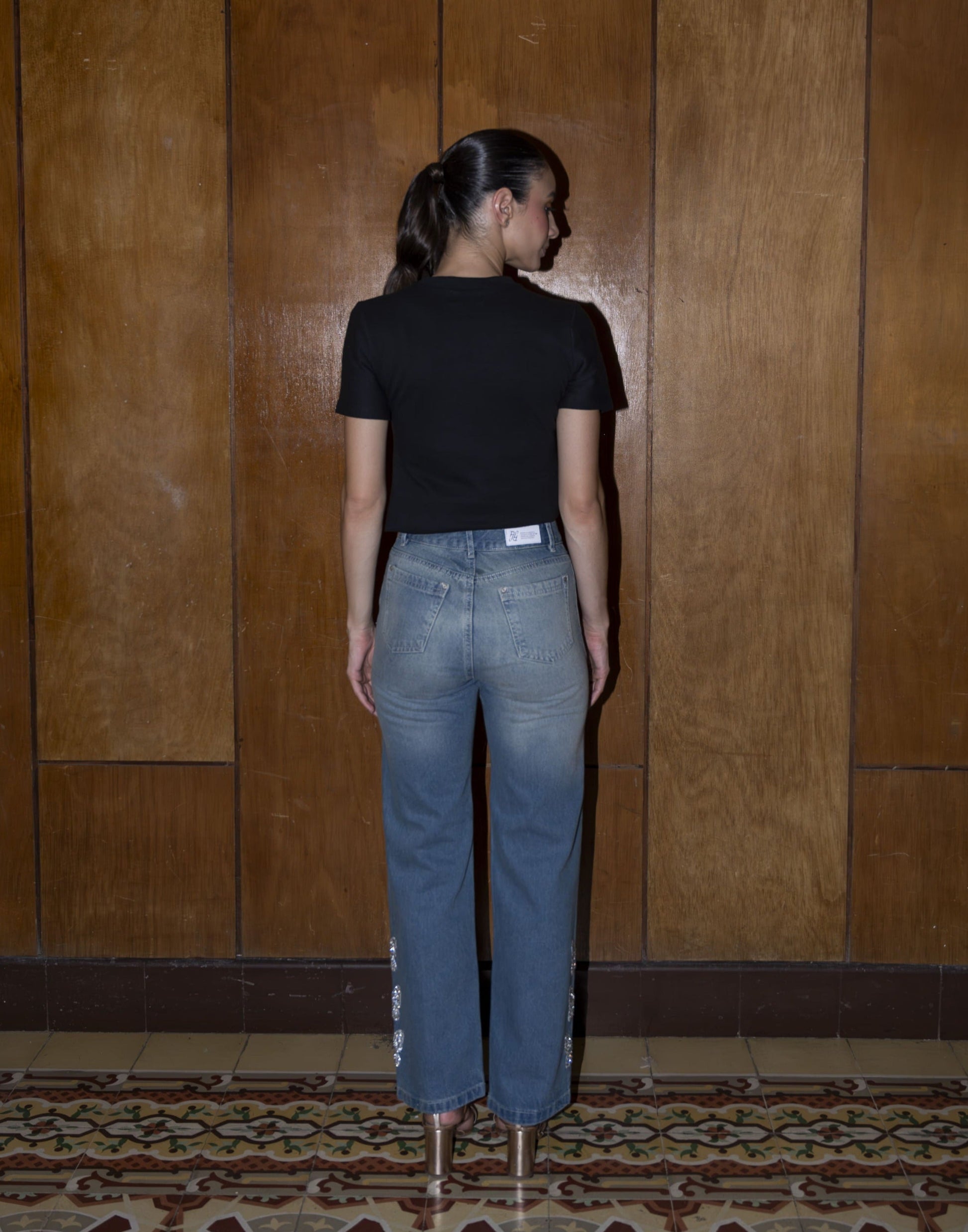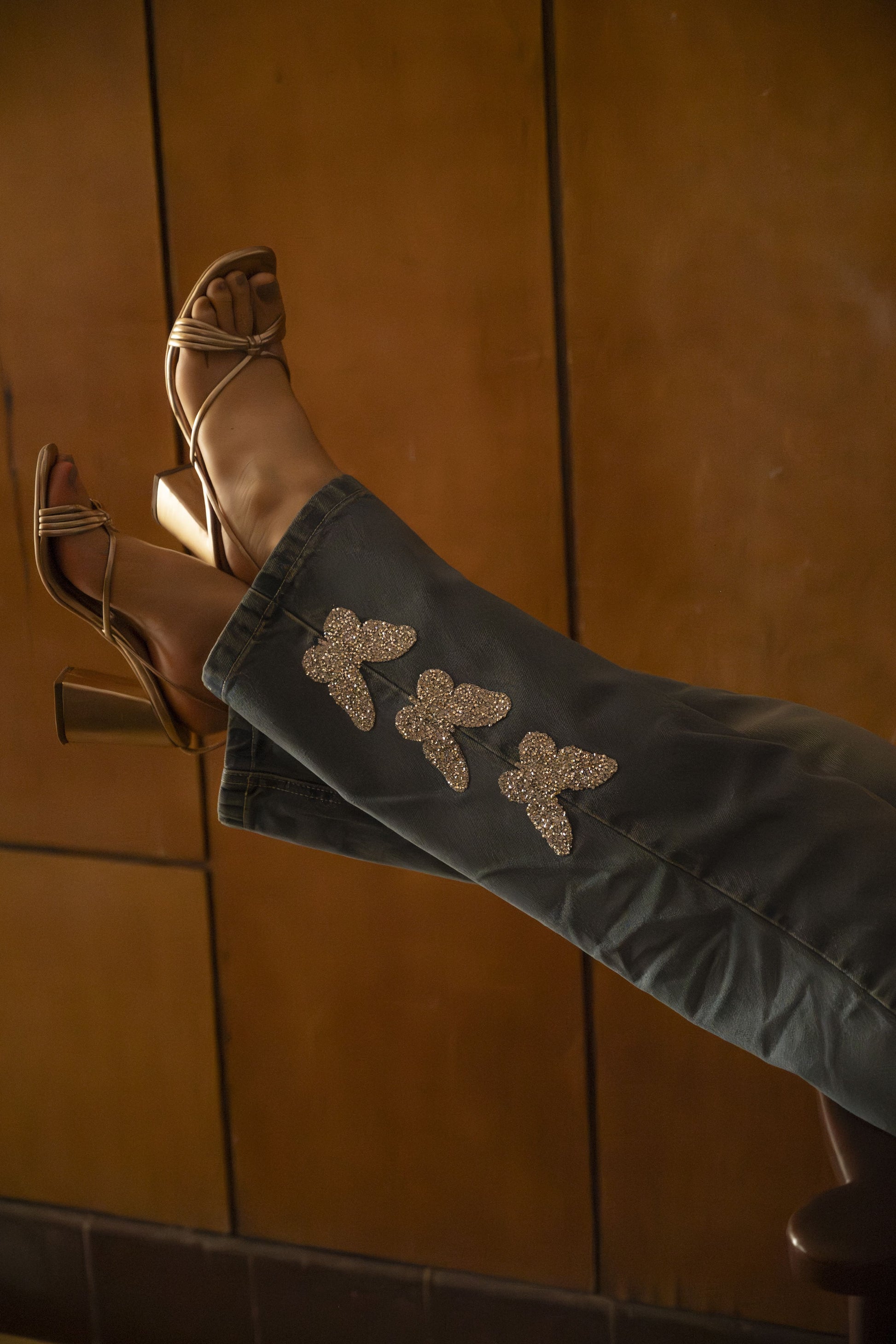 Jean 100% coton, c'est un jean rigide qui s'adapte parfaitement à la silhouette de votre corps, avec des applications papillon qui donnent une touche unique à ce jean,