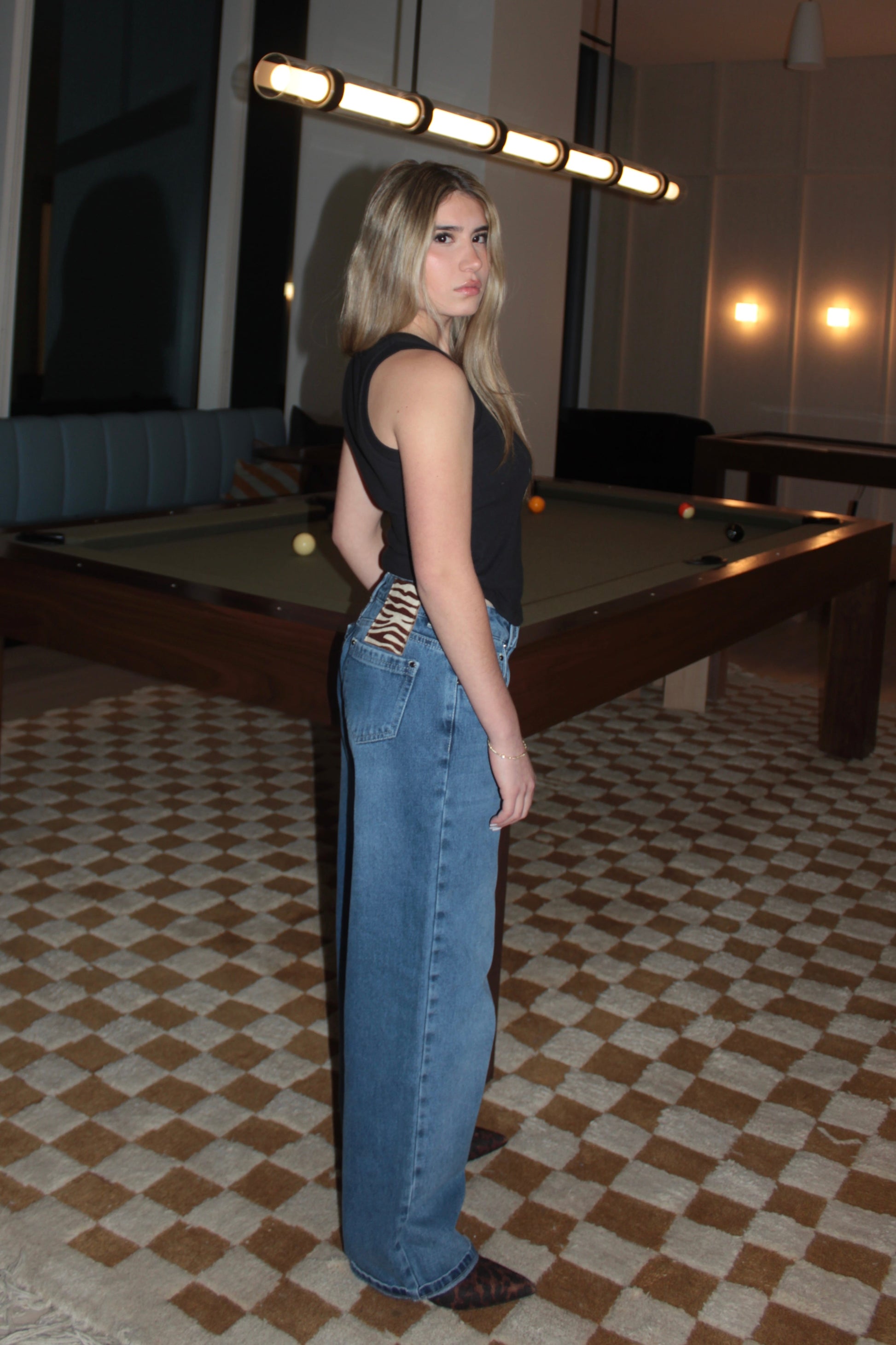 100% cotton jeans in a classic medium blue tone with a soft wash process. This rigid denim adapts perfectly to your body’s silhouette while maintaining a chunky style and wide-leg cut, featuring a unique animal-print back tab for a distinctive touch.