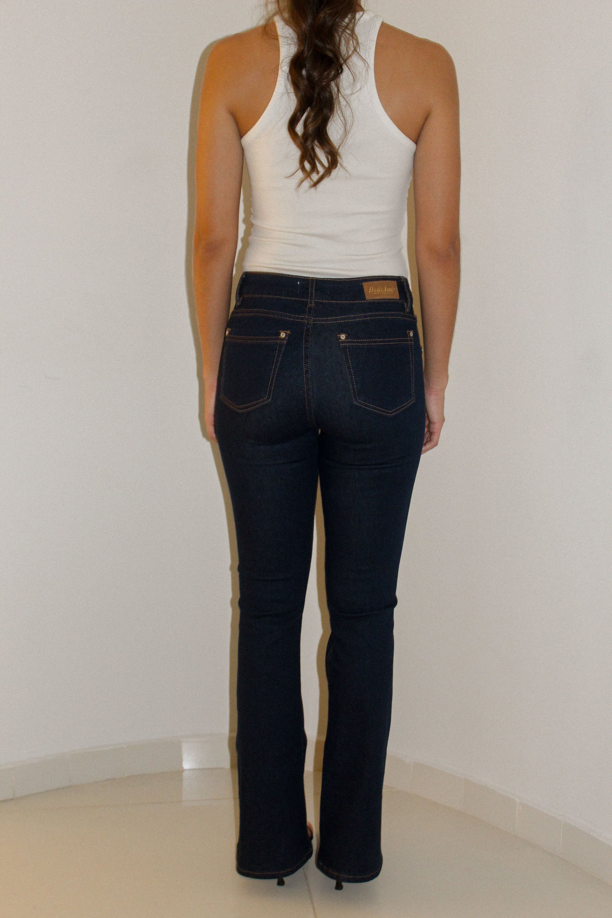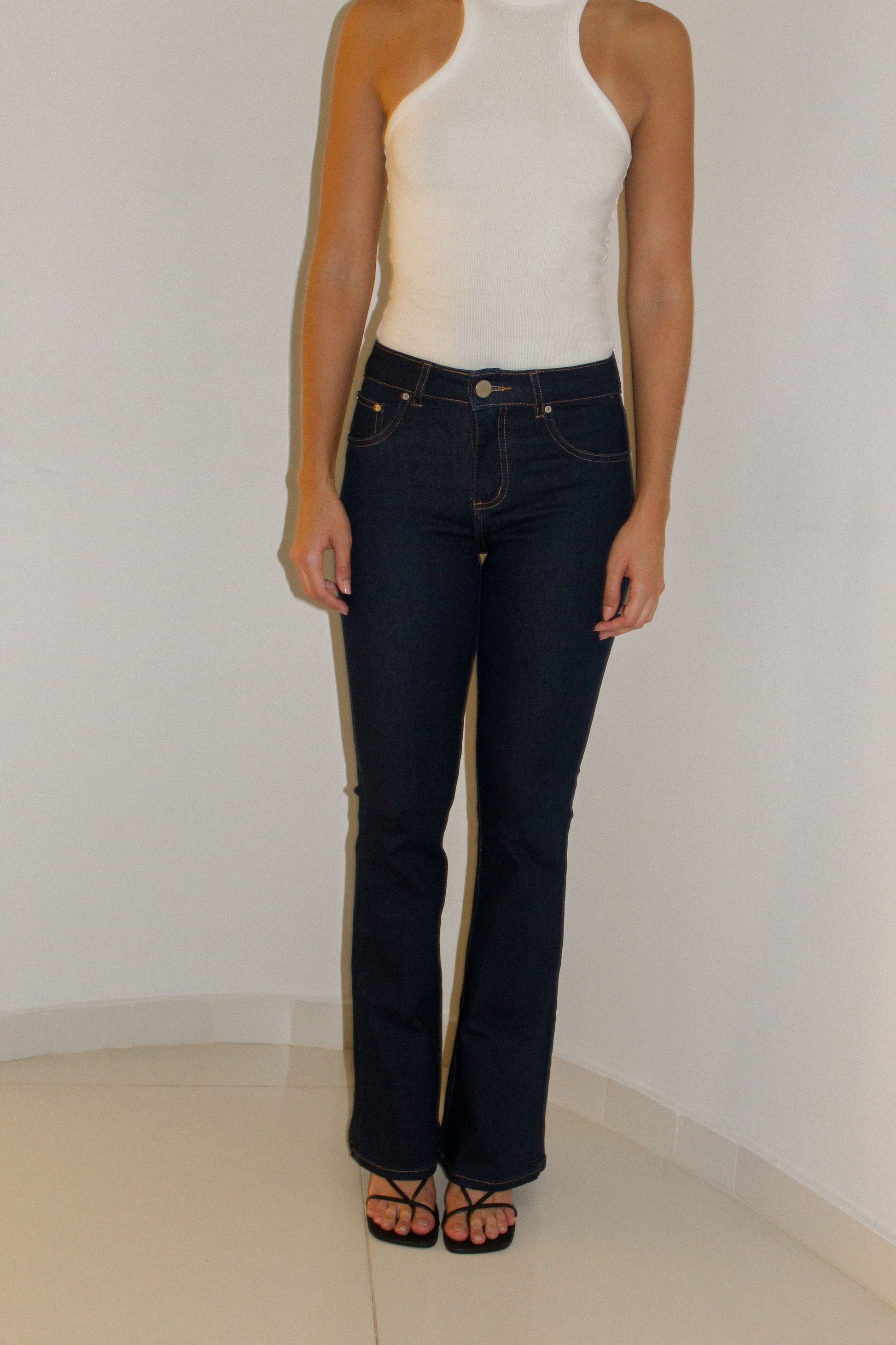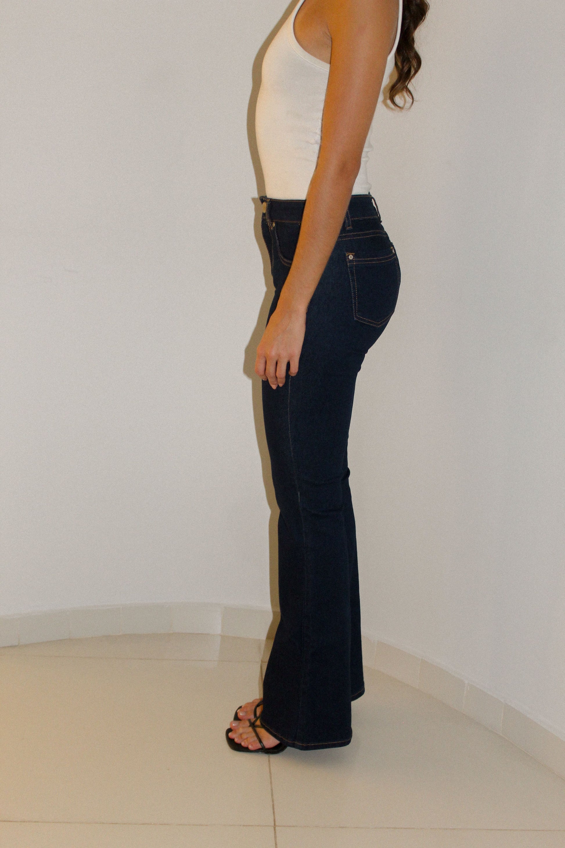 Jean stretch taille mi-haute, semi-patte d'éléphant qui s'adapte parfaitement à la silhouette de votre corps, dans une teinte parfaite pour toutes les occasions, même les plus formelles.