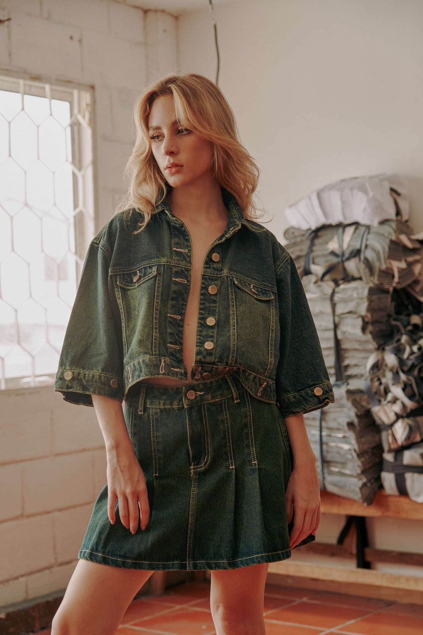 Veste amovible, parfaite pour créer différents looks, jouer et compléter vos pièces, en délavage acide avec une coupe et une couleur idéales, portez-la en ensemble avec notre jean ou jupe Green Washed pour un look complet.