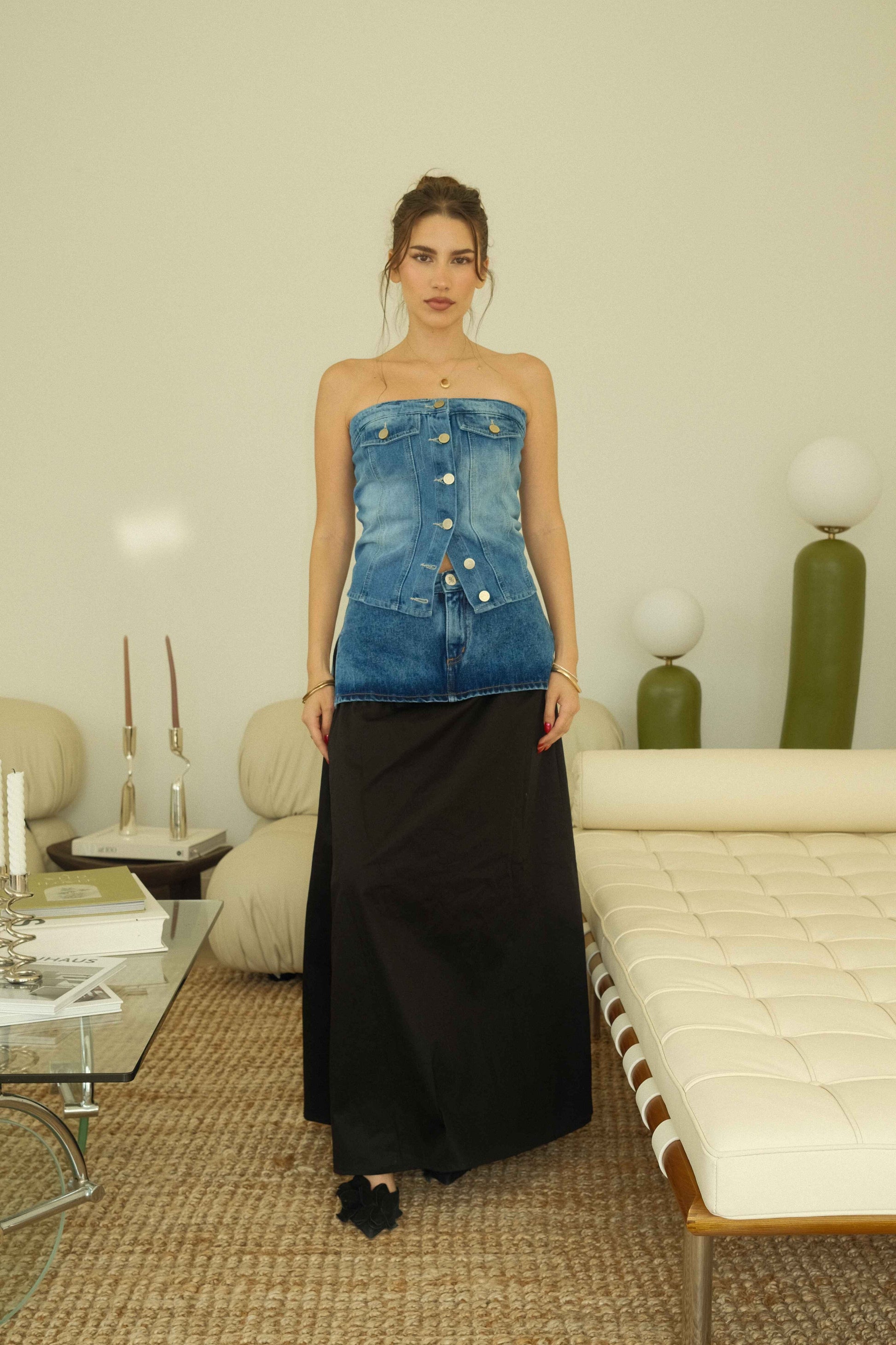 The coolest skirt of this season, this skirt is full of Paula Jassir's brand essence. The upper part is made of 100% cotton denim, medium/high waist, fitted at the waist and the black part is made of a light fabric providing comfort and a very flattering fit.
