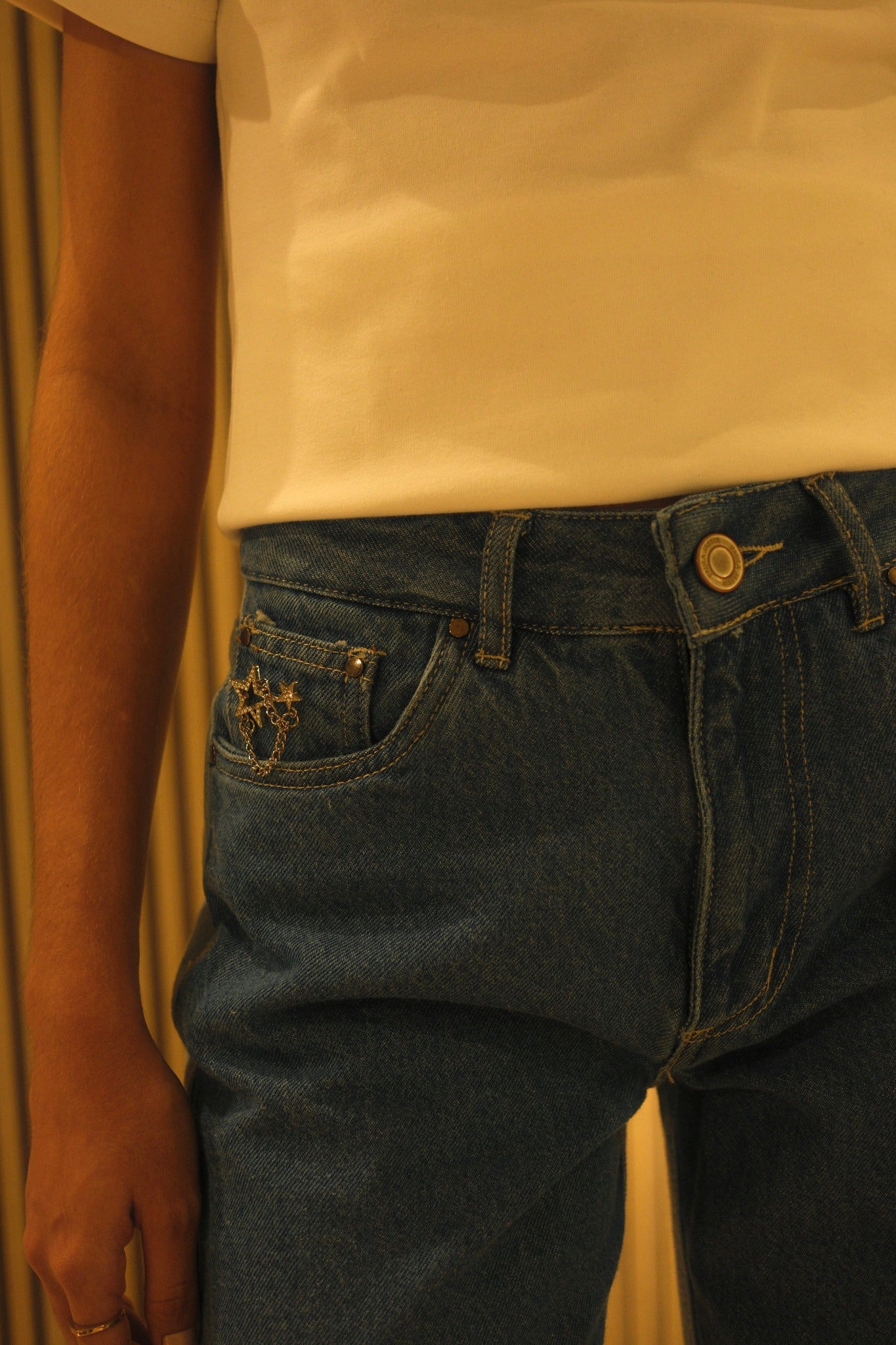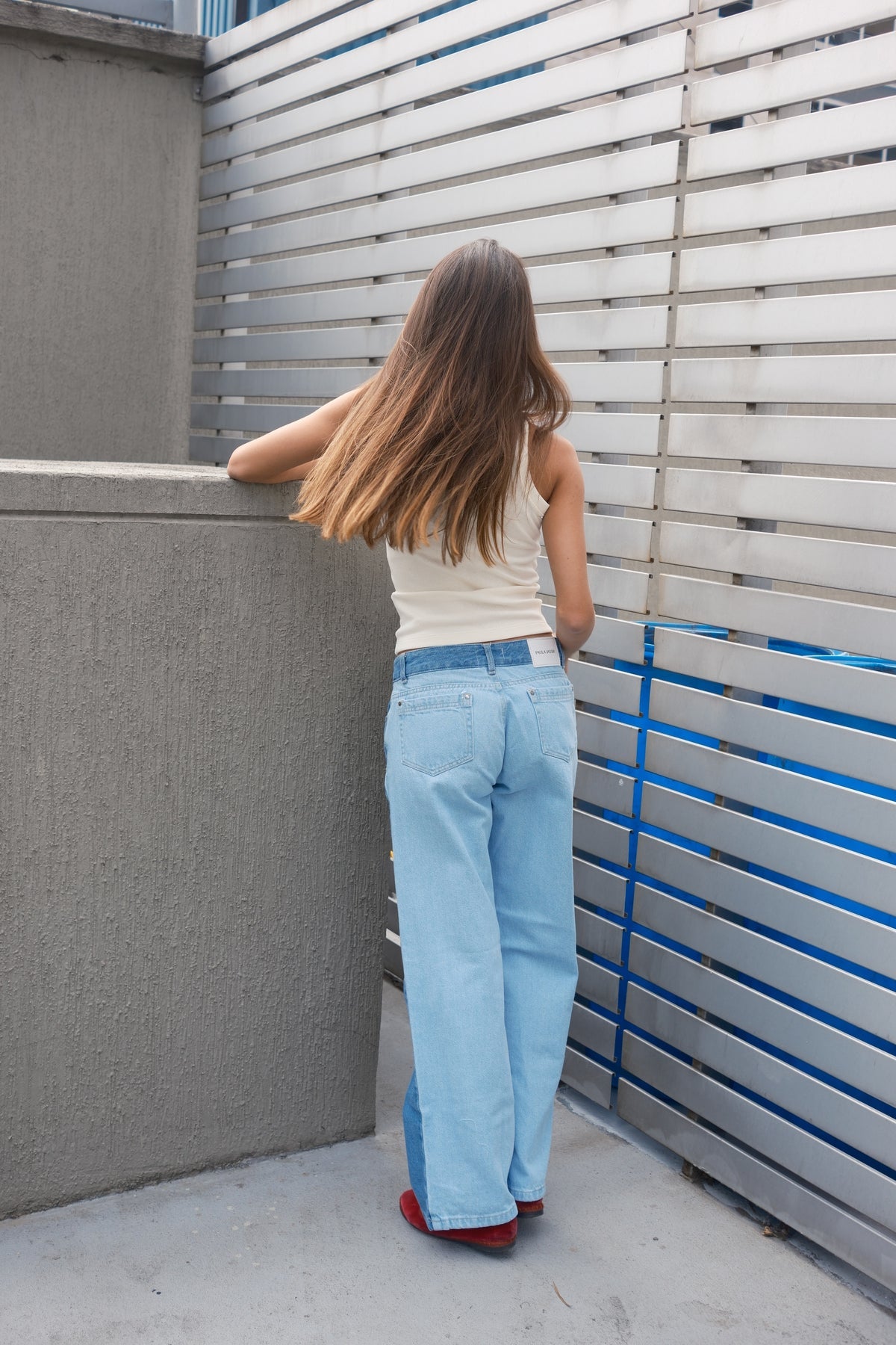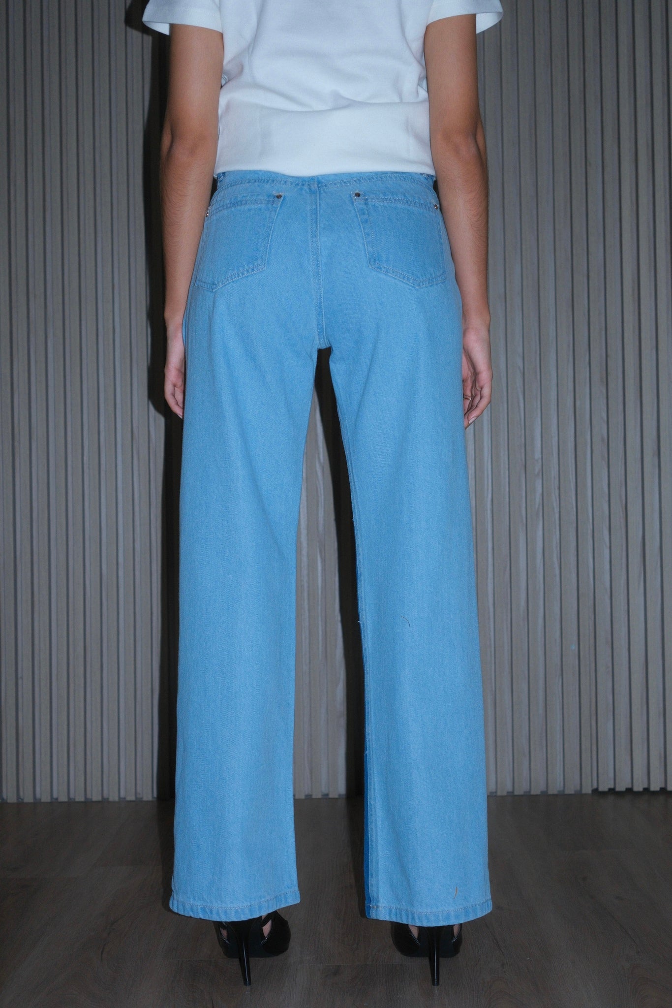 Their rigid denim gently shapes the waist without tightening the legs, striking the perfect balance between structure and comfort. A versatile design for everyday wear, with a relaxed fit and a unique visual finish—ideal for fresh, modern looks.