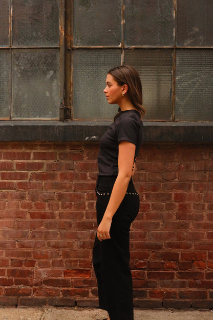 Black jeans with PJ’s signature touches that give them a unique look, featuring shiny studs and a metallic animal print claw detail.