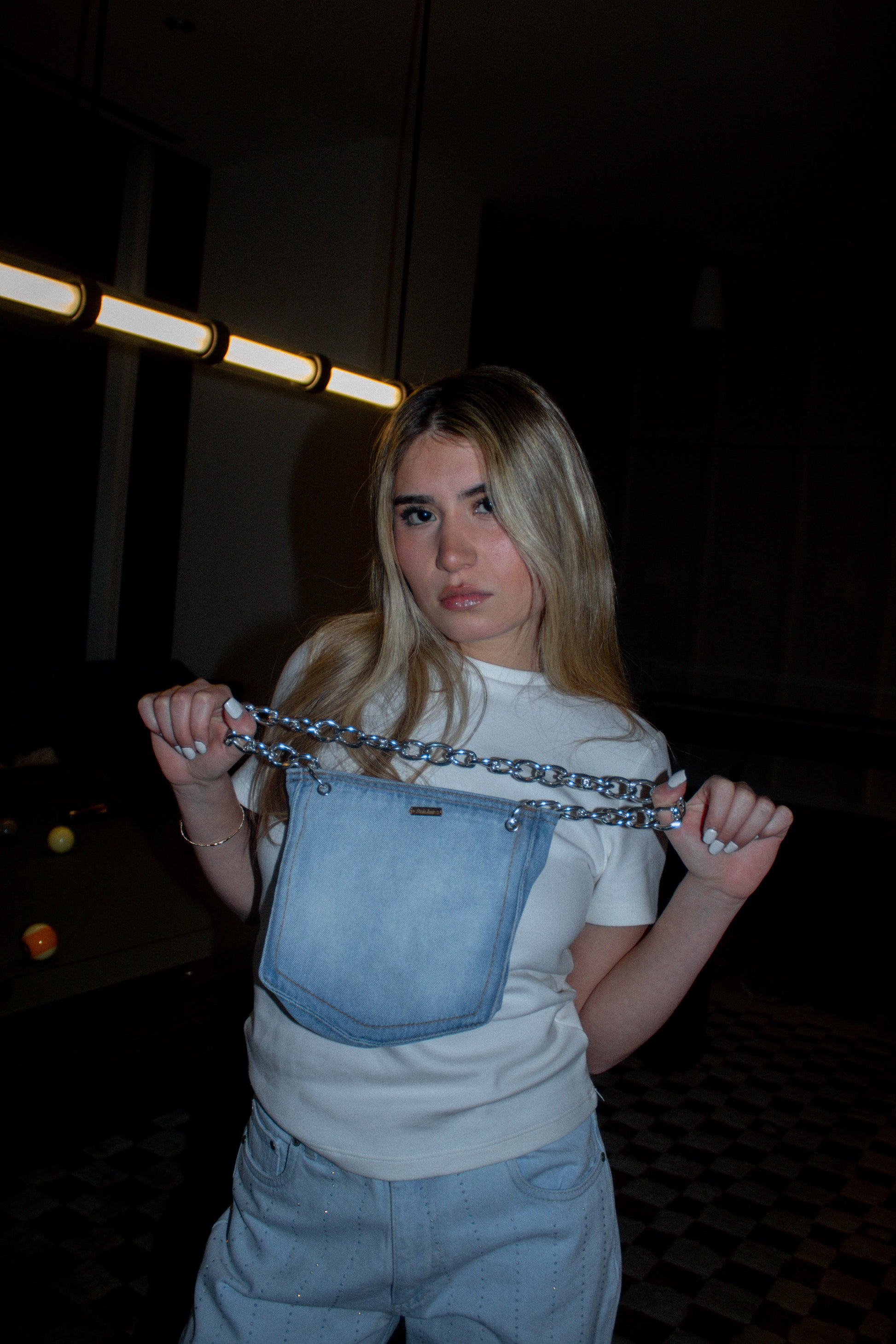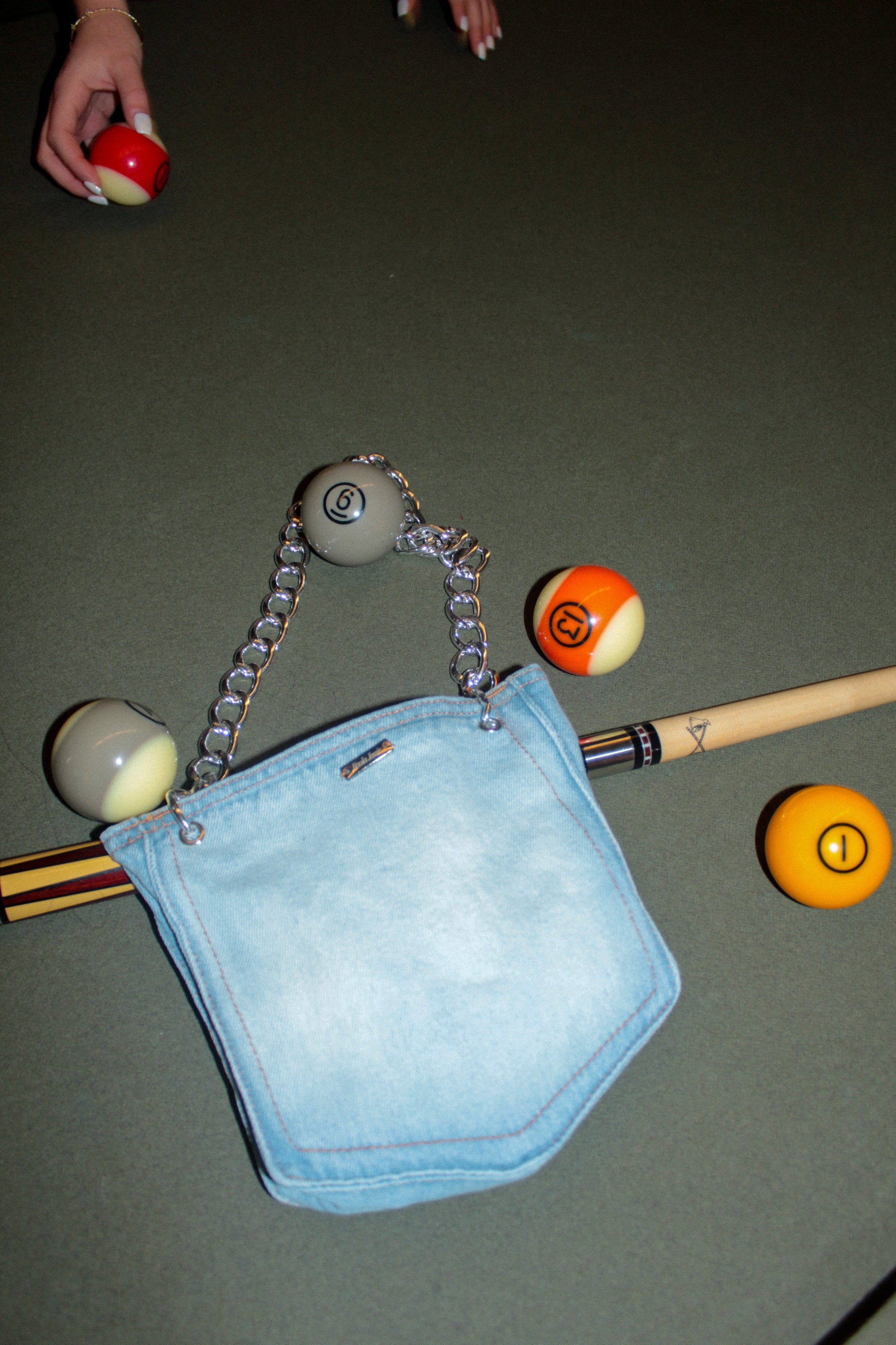 Denim bag mimicking a structured pocket design, featuring a thick silver chain. The chain allows it to be worn over the shoulder or on the forearm.